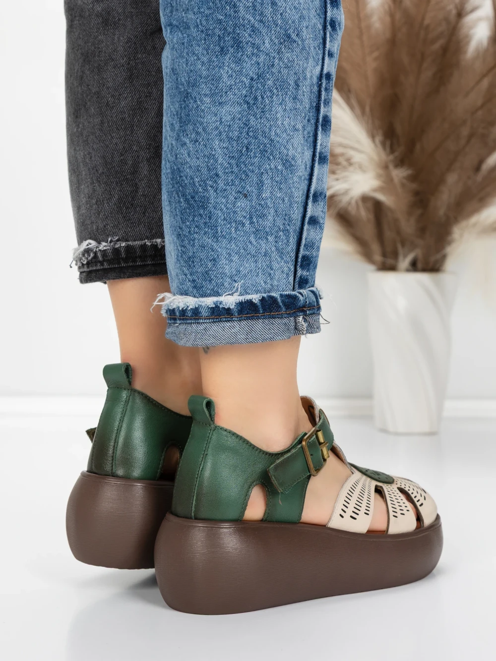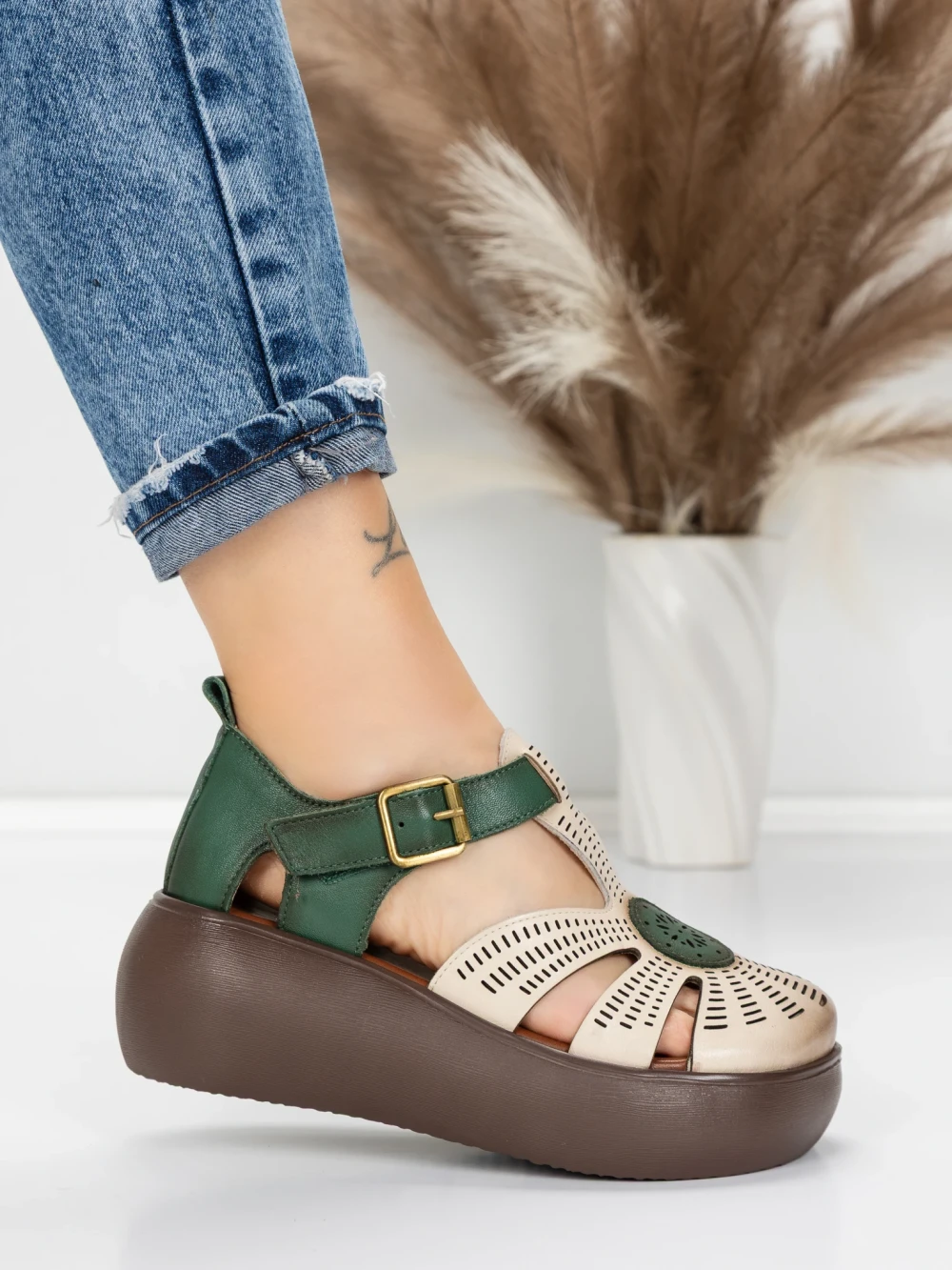 Sandale Dama din piele naturala 10682 CREAM-GREEN | ADVANCER
