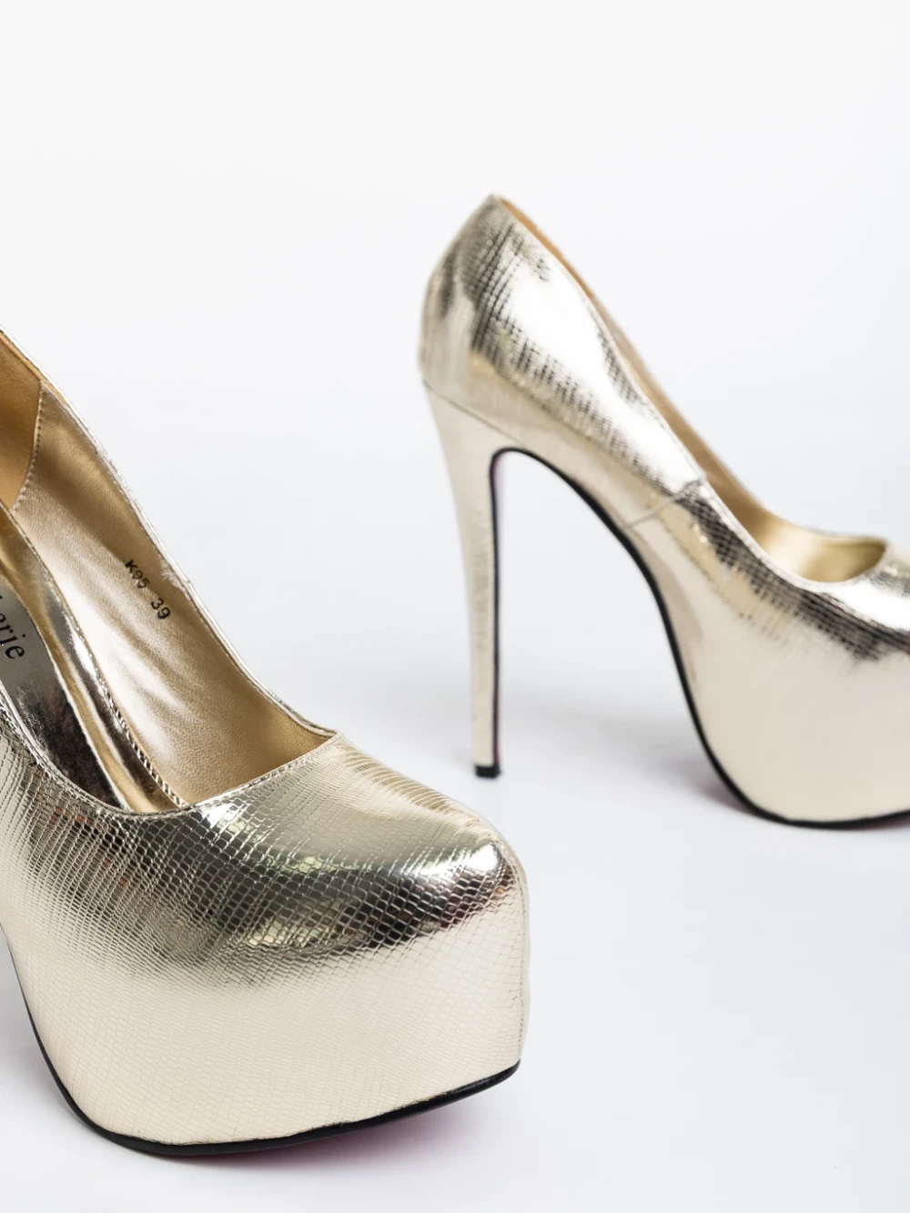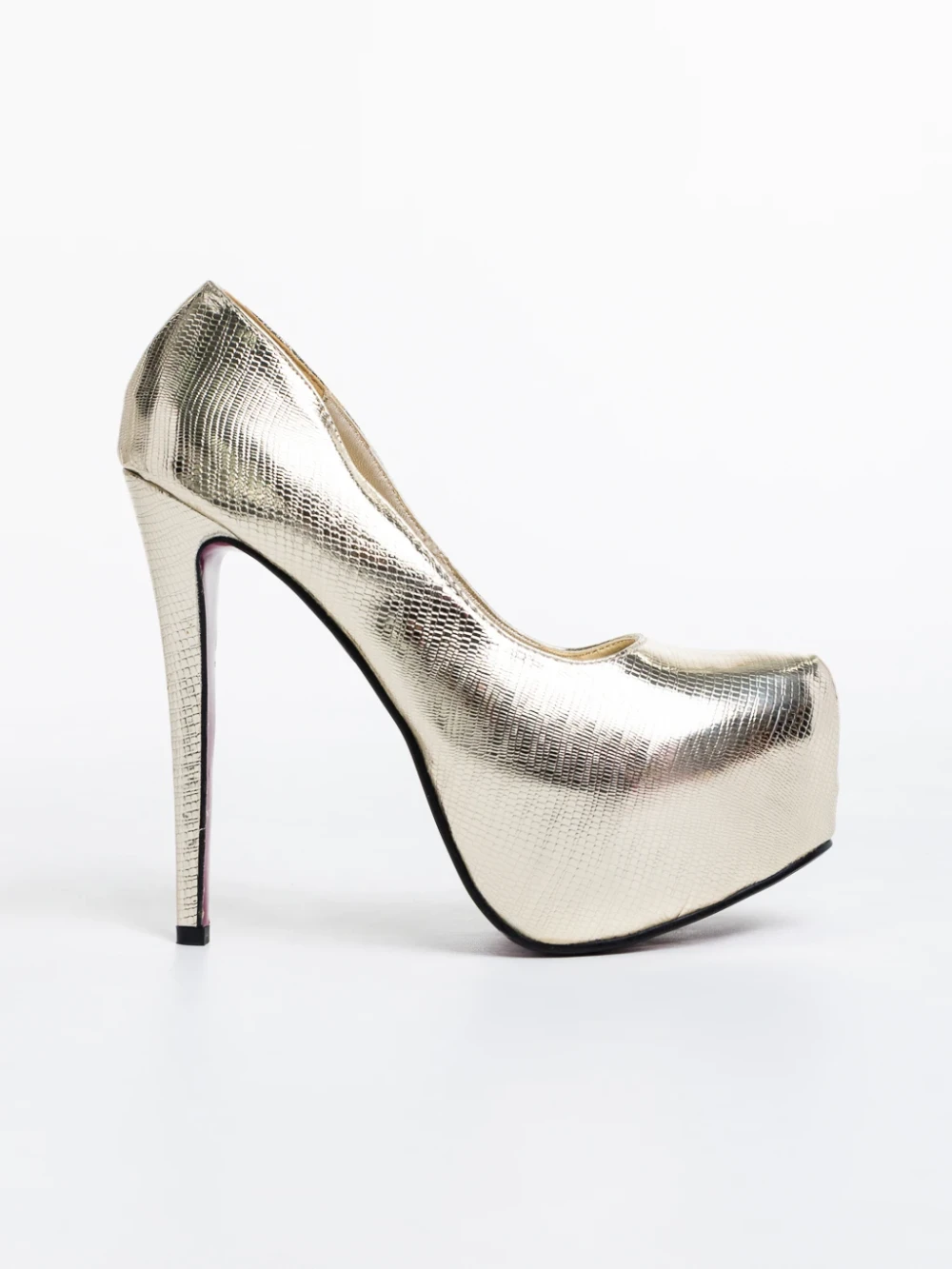 Evanthia aranyszínű, női magassarkú cipő, lakkozott ökológiai bőrből